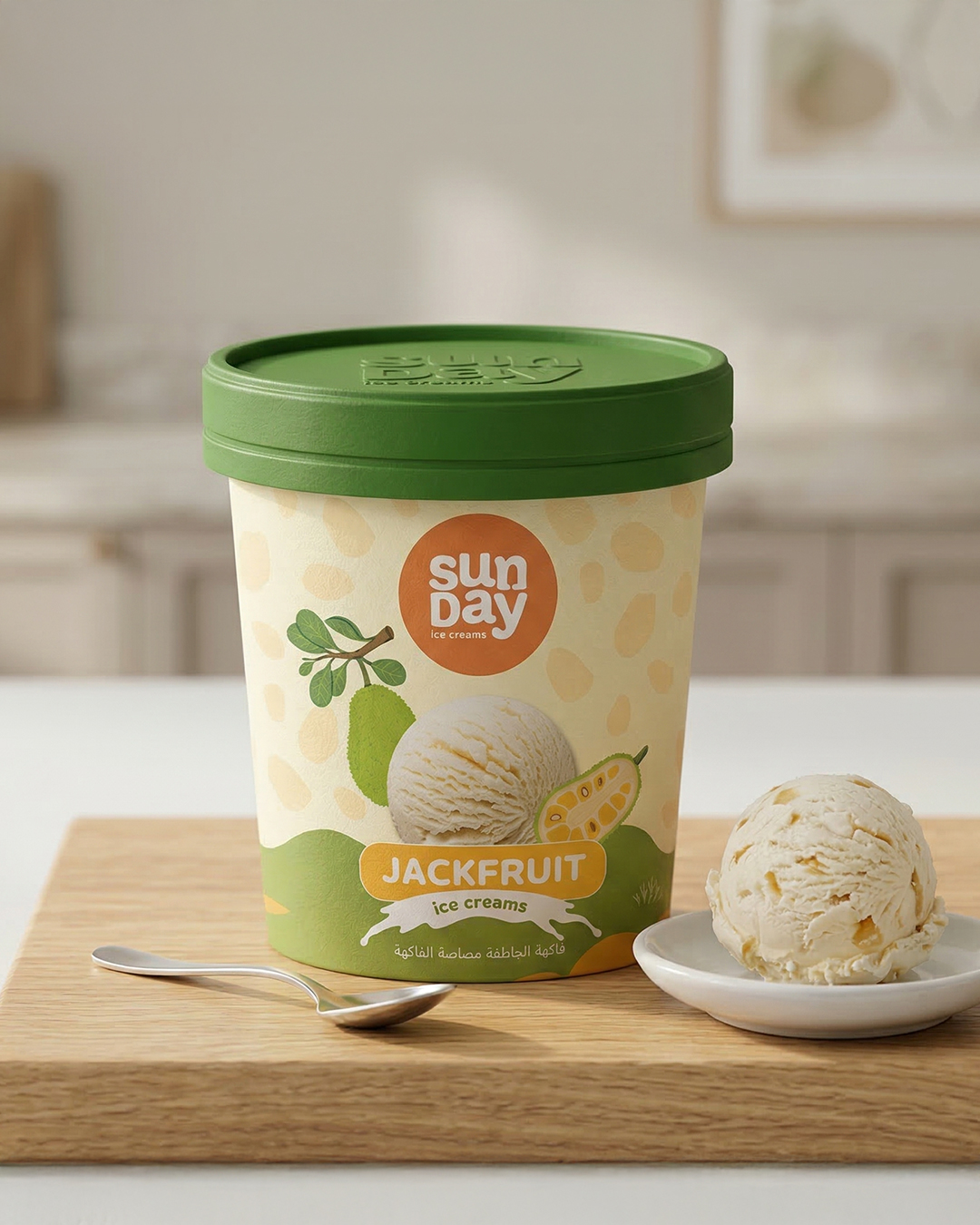 The Sunday Jackfruit Ice Cream packaging was designed to capture attention through a clean and refreshing visual approach. By focusing on natural tones, clear typography, and appetizing product representation, the design enhances shelf appeal while communicating flavor and quality at a glance.